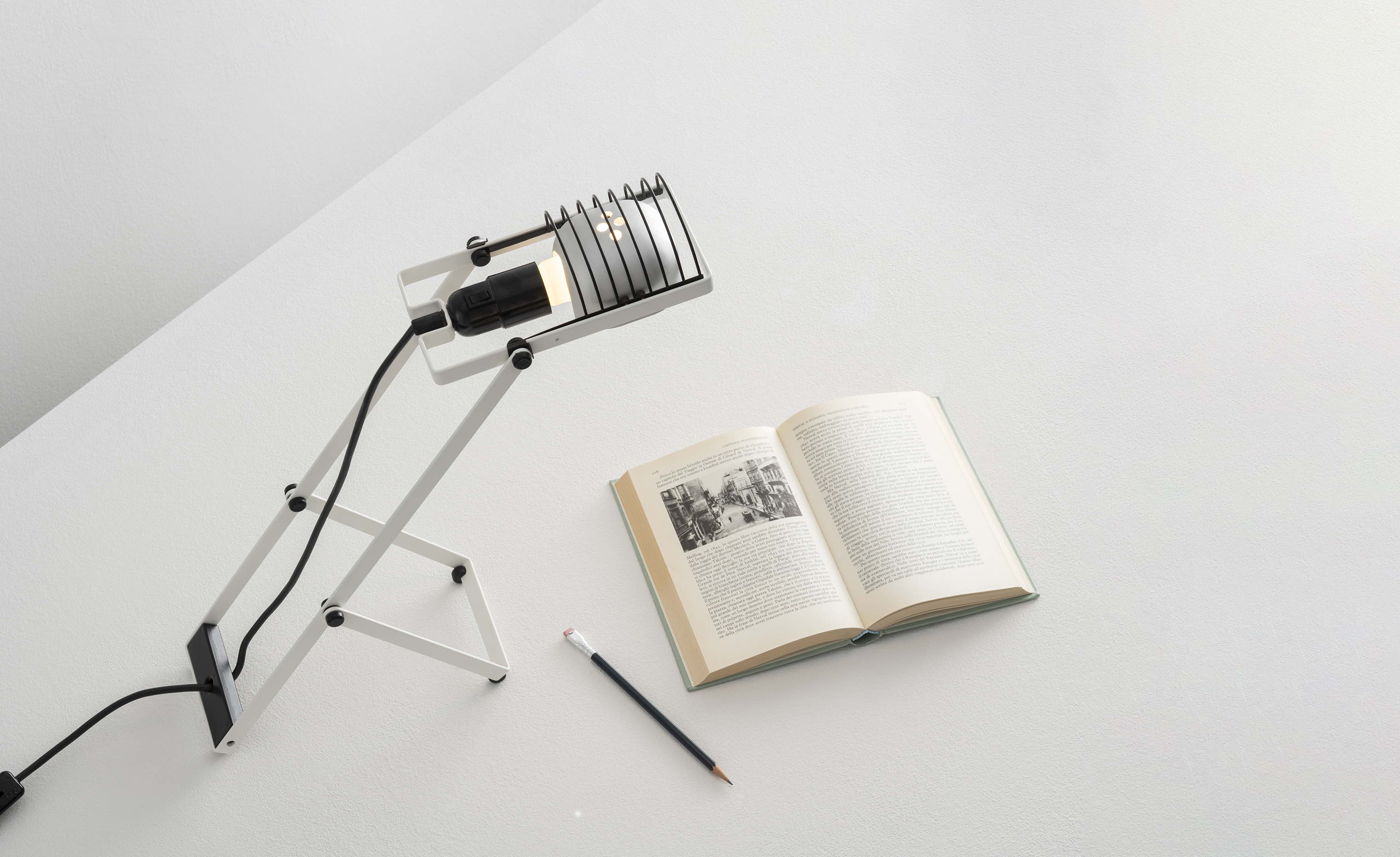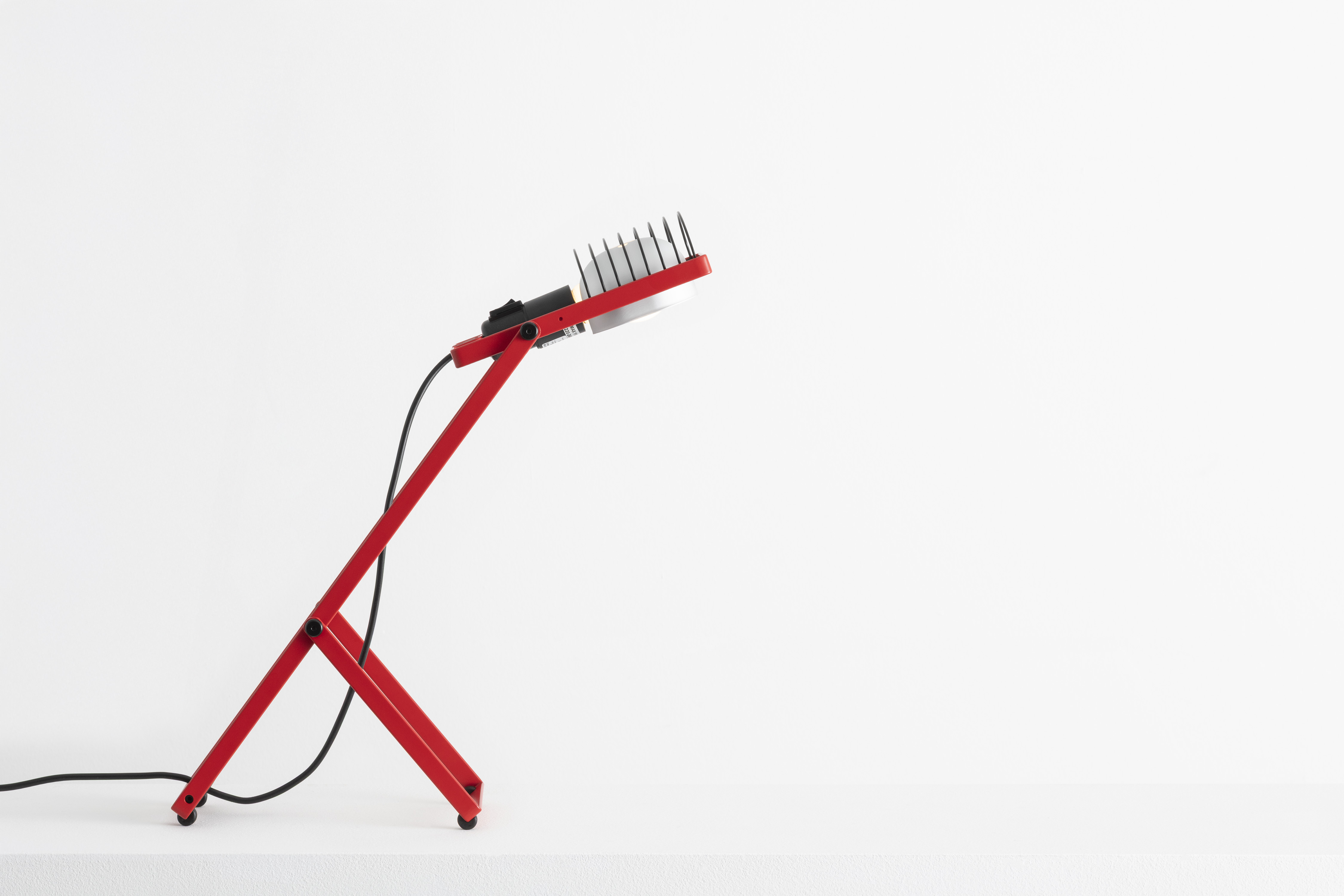Its essential structure, composed of a few curved metal elements, reflects Artemide’s pursuit of balance between form and function. Two C-shaped profiles of different lengths form a Y-shaped support which, through a simple opening and closing movement, allows the lamp’s height and inclination to be adjusted, offering freedom of orientation and versatility of use.